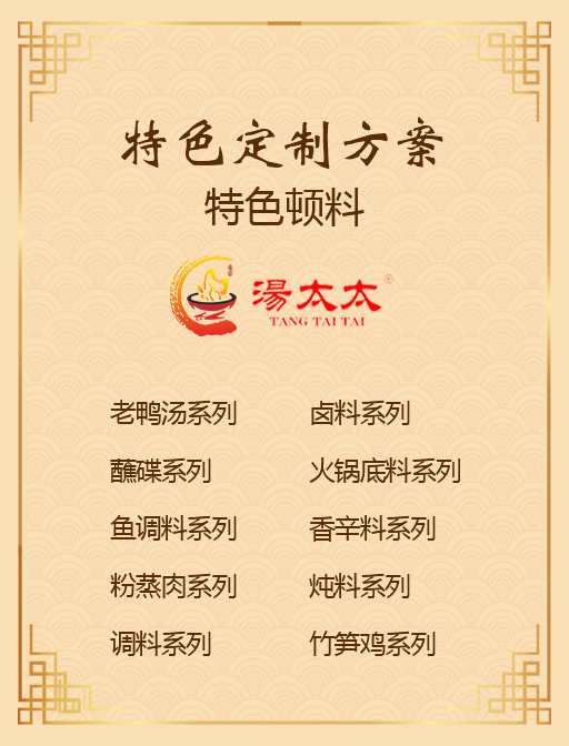 重慶湯太太提供特色湯料,這里你可以找到屬于自己的口味、產(chǎn)品、服務(wù),我們根據(jù)不同的客戶(hù)我們制定了一套方案,根據(jù)客戶(hù)需求可定制產(chǎn)品的大小分量以及特殊要求。